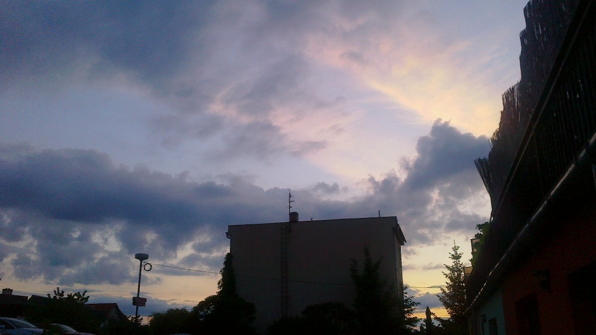 Po přívalovém dešti, lokálně krupobití (bez bleskové aktivity) aktuálně: skoro zataženo, trvalý mírný déšť, dusno a silný opar