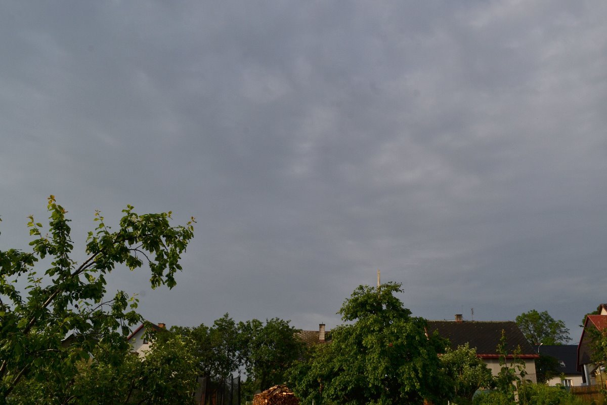V noci bouřilo a pršelo. Srážky 13,2 mm. Tlak 1018 hPa, vlhkost 92%, vítr J 0,2 m/s.