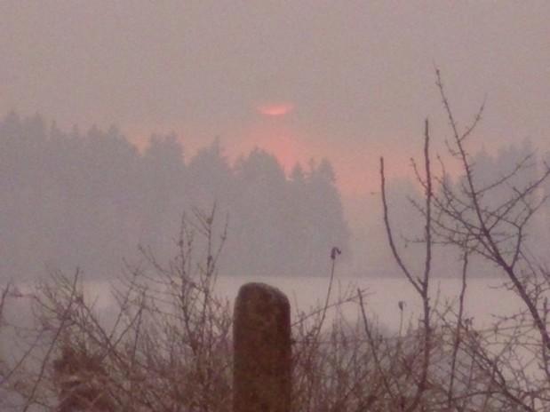 Je skoro jasno,ale takový mlhový opar.Viz.na obrázku vycházející slunce.