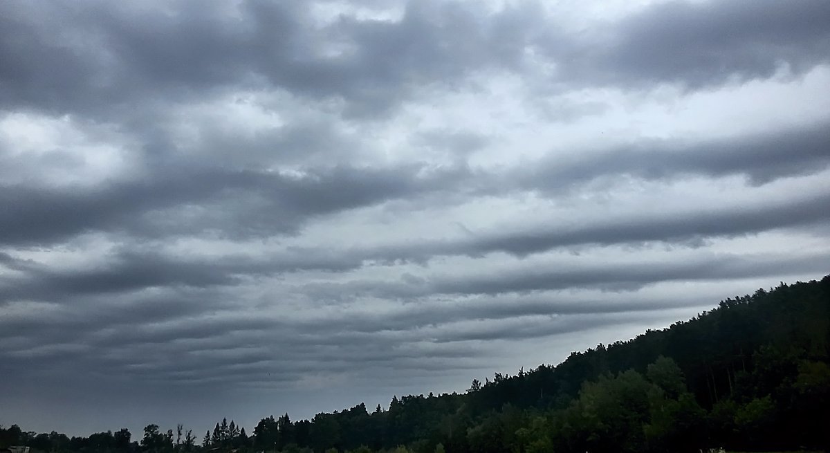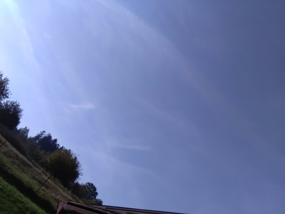 Fotografie zachycuje mlžný opar a oblohu zataženou oblačností různých pater. Tlak 1014 hPa a vítr je slabý od severozápadu.
