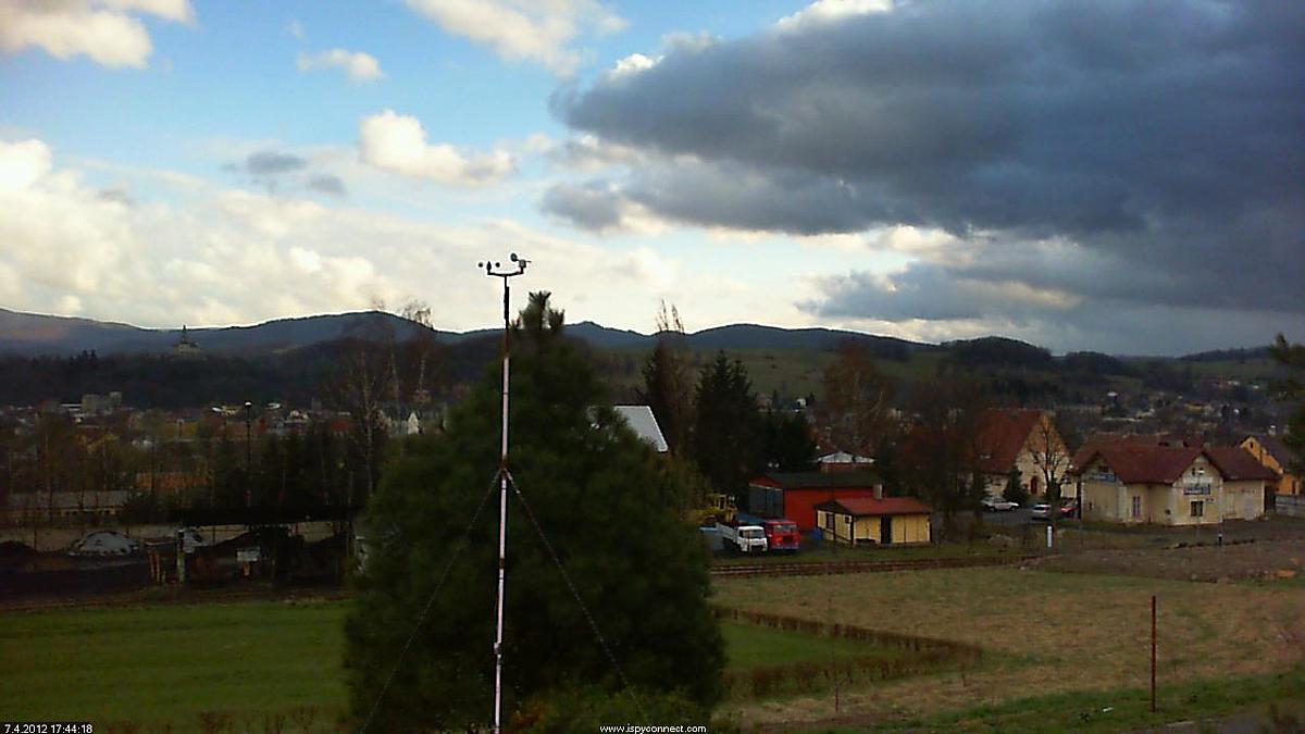 Skoro zataženo.CCa v 17hodin přehánka se sněhovými krupkami.Na fotce oblačnost po přechodu fronty a vdáli je vidět už částečné protrhávání oblačnosti.