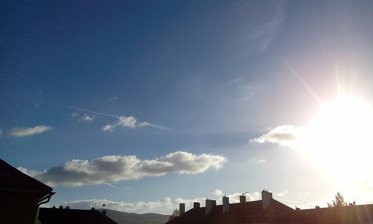 Skoro zataženo,výjimečně vyleze modrá obloha nebo kousek slunce skrz mraky jako právě teď