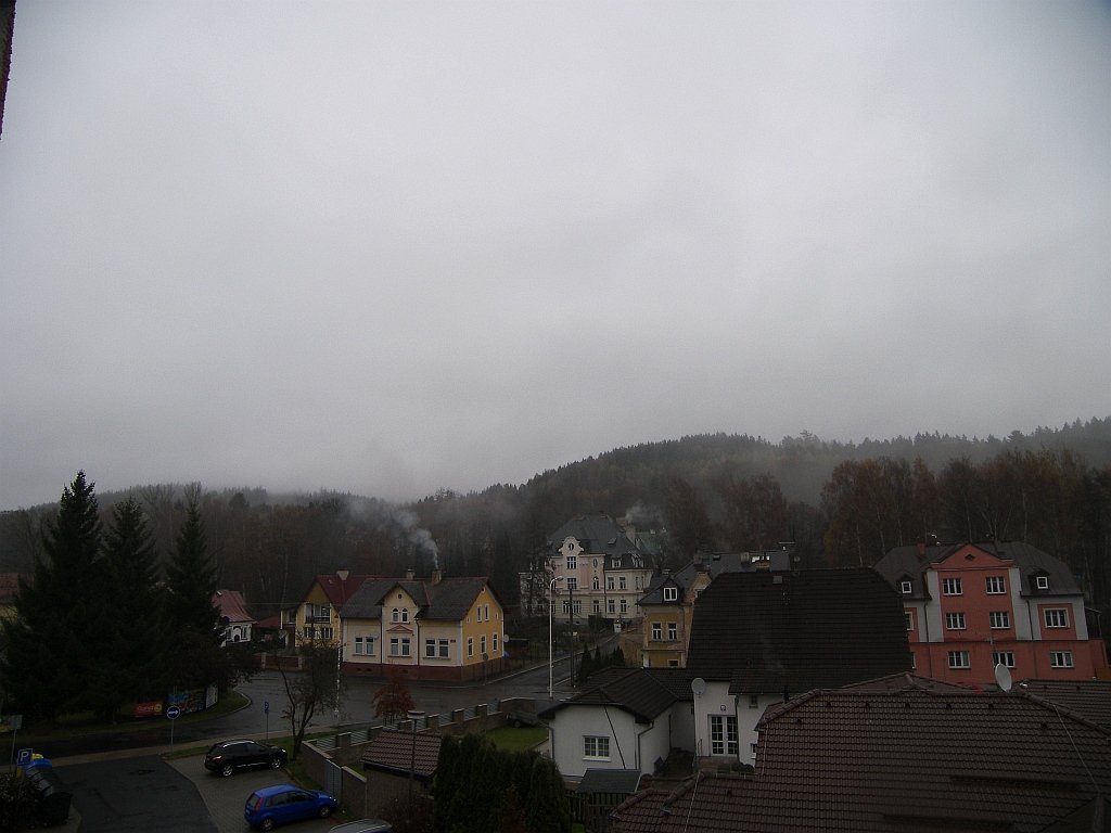 Mlha s dohledností cca 400 m,občas drobně mrholí, tlak 1021,8 hPa, slabý JV vítr.