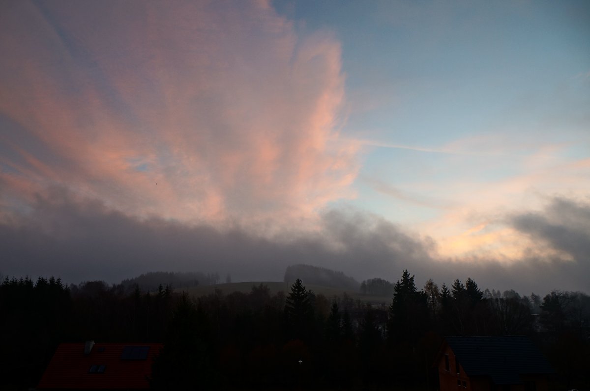 Oblačno,jihovýchodní vítr ,od východu se žene nízká oblačnost