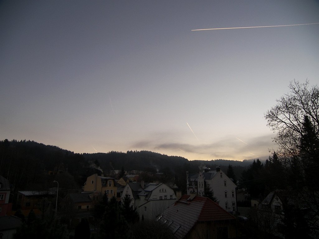 Tlak 1031,6 hPa, vlhkost 92 %, klidno. Ranní minimum -8,1 °C.