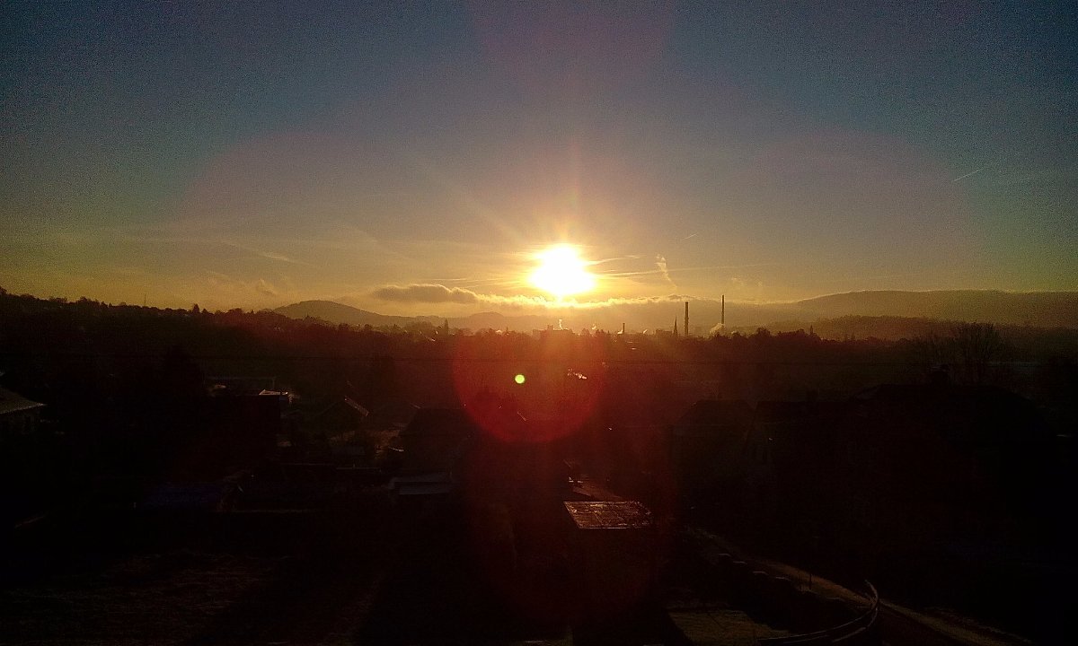 ... na fotce ještě jasný rozbřesk s od prava (z jihu) se plížící mlhou nad V obzorem, během ani né pěti minut na nás dopadl "krajáč mléka" současná dohlednost do 200m... ..skoro jasno (jen řasy-kondenz), na všem námraza, neznatelné JV proudění při zemi...