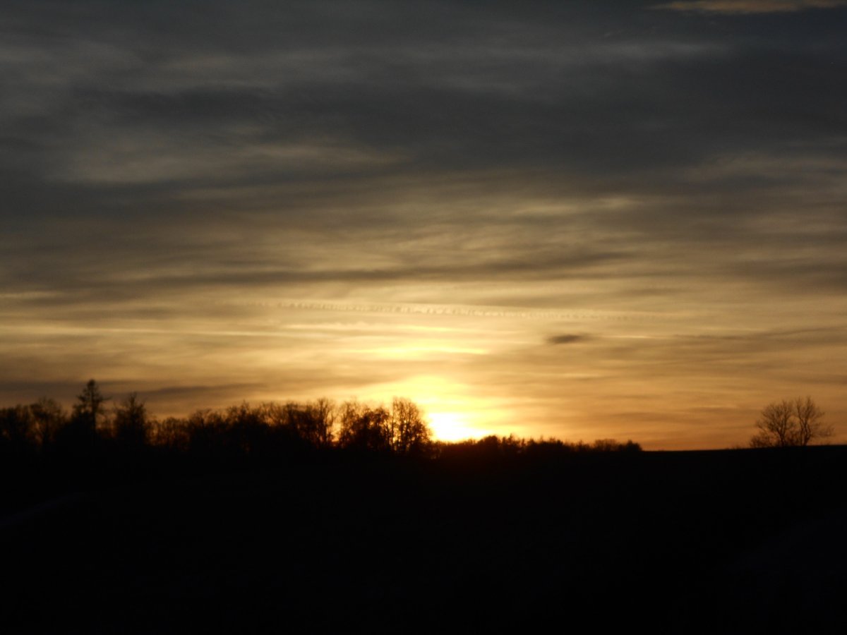 Zataženo nízkou inverzní oblačností a mlhavo, vane mírný jihovýchodní vítr, tlak: 1033 hPa. Foto zachycuje západ slunce nad inverzí.