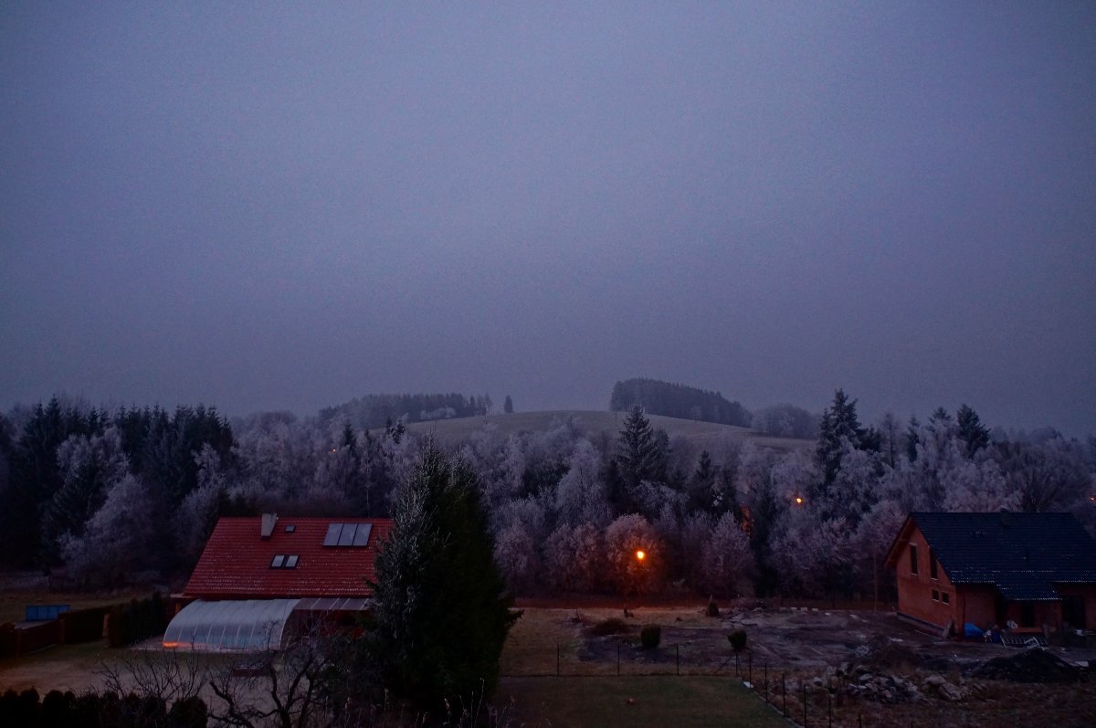 zataženo, mlhavo, před chvíli začalo drobně sněžit, tvoří se poprašek