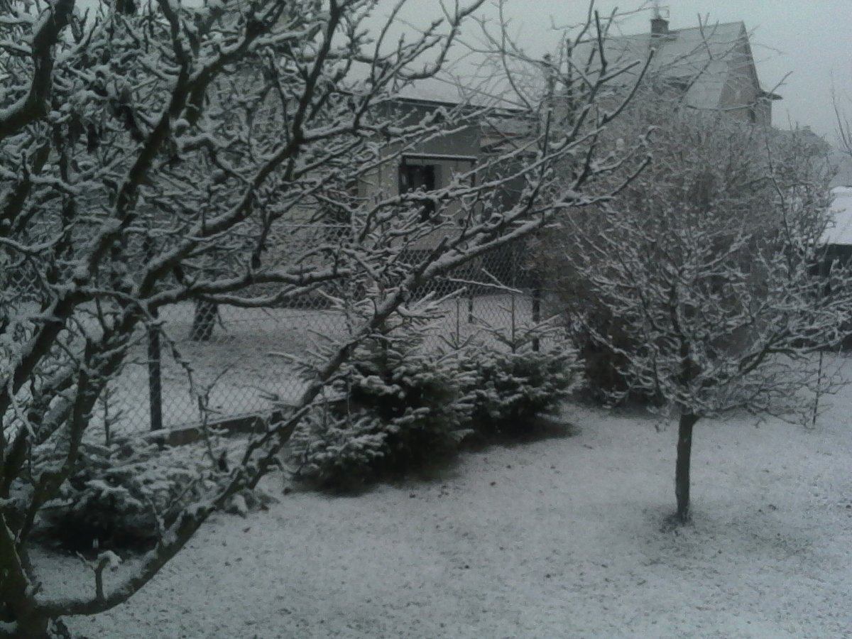 Slabé sněžení na studené frontě. Slabý vítr. Tlak 1033,8 hPa.
