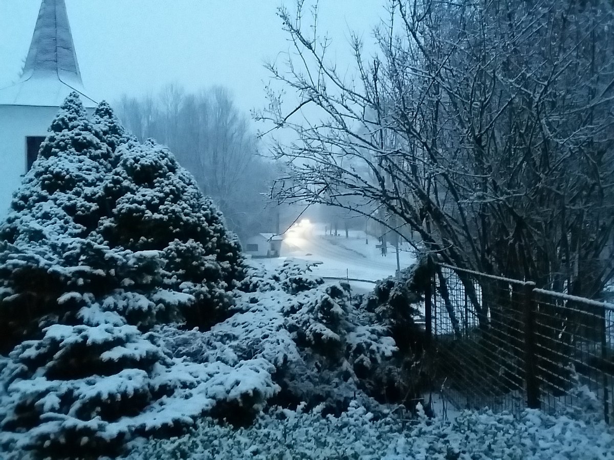 Zamračené a slabé sneženie, slabá hmla