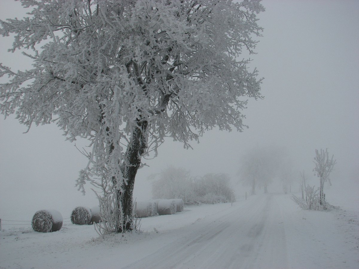 Hustá mrznoucí mlha, Slunce trochu prosvítá, námraza, jinovatka, slabý vítr. Sníh celkem 13 cm - zmrzlý. Foto 13.47 hod.