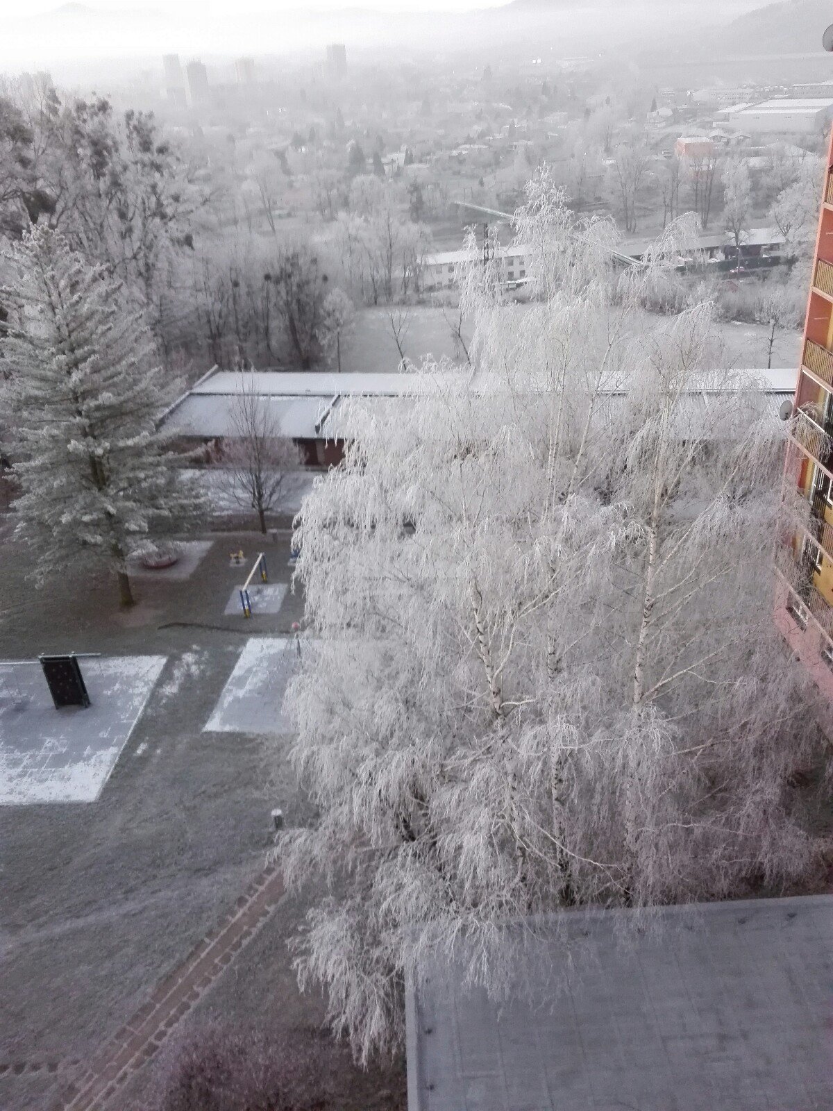 mrznoucí mlha + mrholení, námraza a naledí, slabý vítr