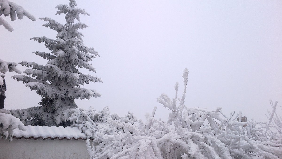 V dálce mlhavo, sem tam drobounce sněží, či mrholí, námraza místy už přes 3 cm, vítr J 0,1 m/s, tlak 1037 hPa, vlhkost 96%