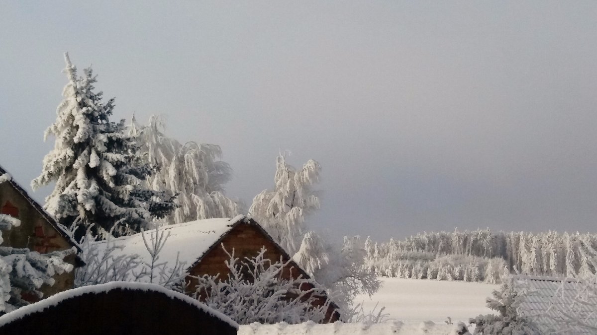 Ráno v 7:00 bylo ještě -5.8, otepluje se. Kouřmo, částečně je vidět modrá obloha. Na místech otevřených na jih má námraza i 10 cm.