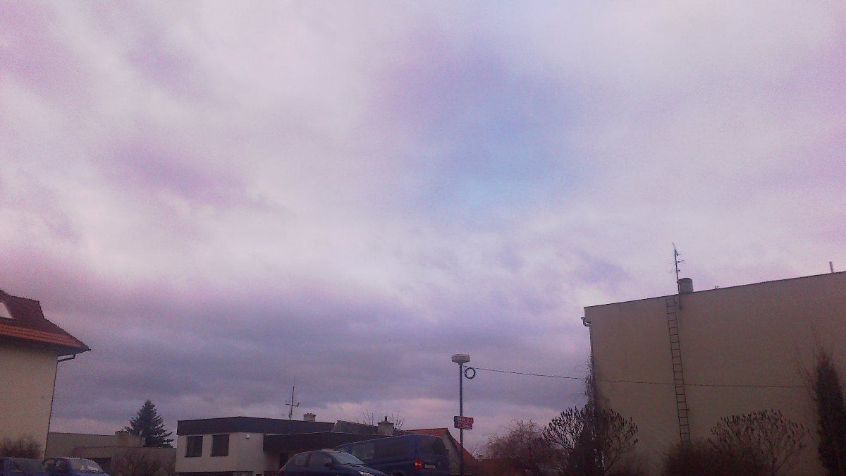 ... po soumraku skoro vyjasnění, zesilující vítr, od rána úplně zataženo, silný SSZ vítr s nárazy, asi hoďku poletuje drobounký snížek nemající zatím šanci ulpívat na "teplé" oschlé - vyfoukané zemi...