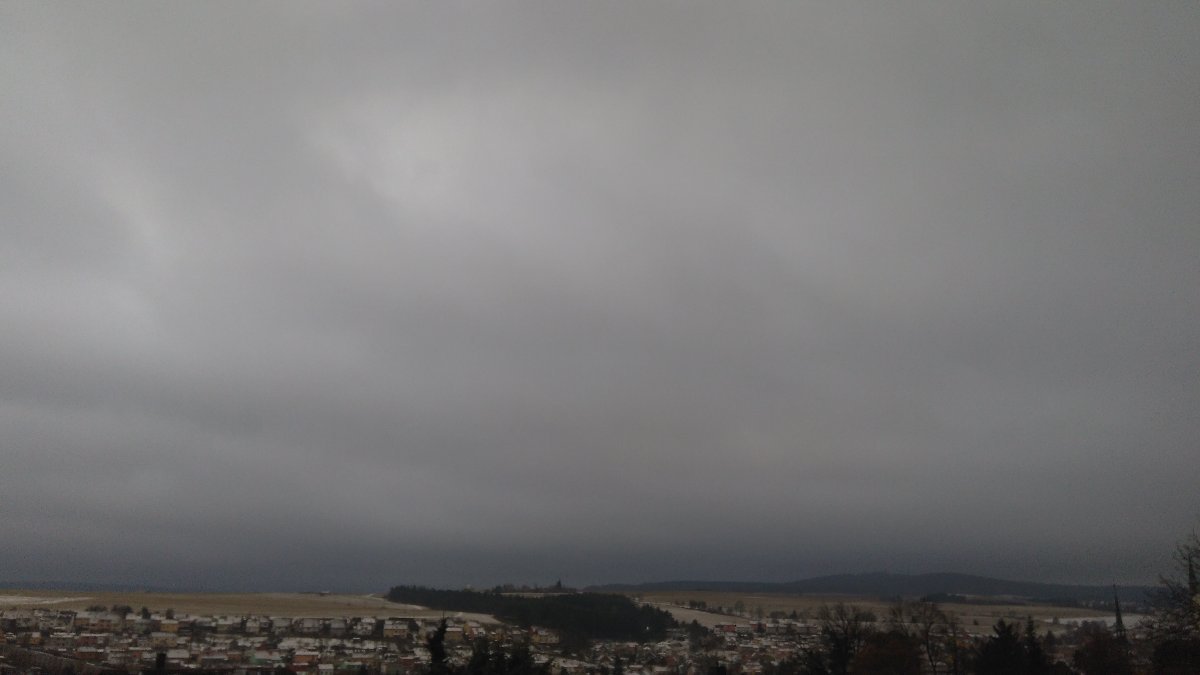 Slabě sněží, oblačnost 100%, zákl.oblačnosti 680,73m.n.m., tlak 1017,7hPa↓, dohlednost 7km, rel.vlhkost 90,8%, abs.vlhkost 3,79g/m3, ZSZ větřík 286° 1,6m/s(2 Bft), poc.teplota -5,56°C, ochl.větrem -4,32°C, tepl.ros.bodu -3,41°C, tepl.mraků -4,65°C, ozon 315D.U.(-7%,normální stav), HUMIDEX -4.