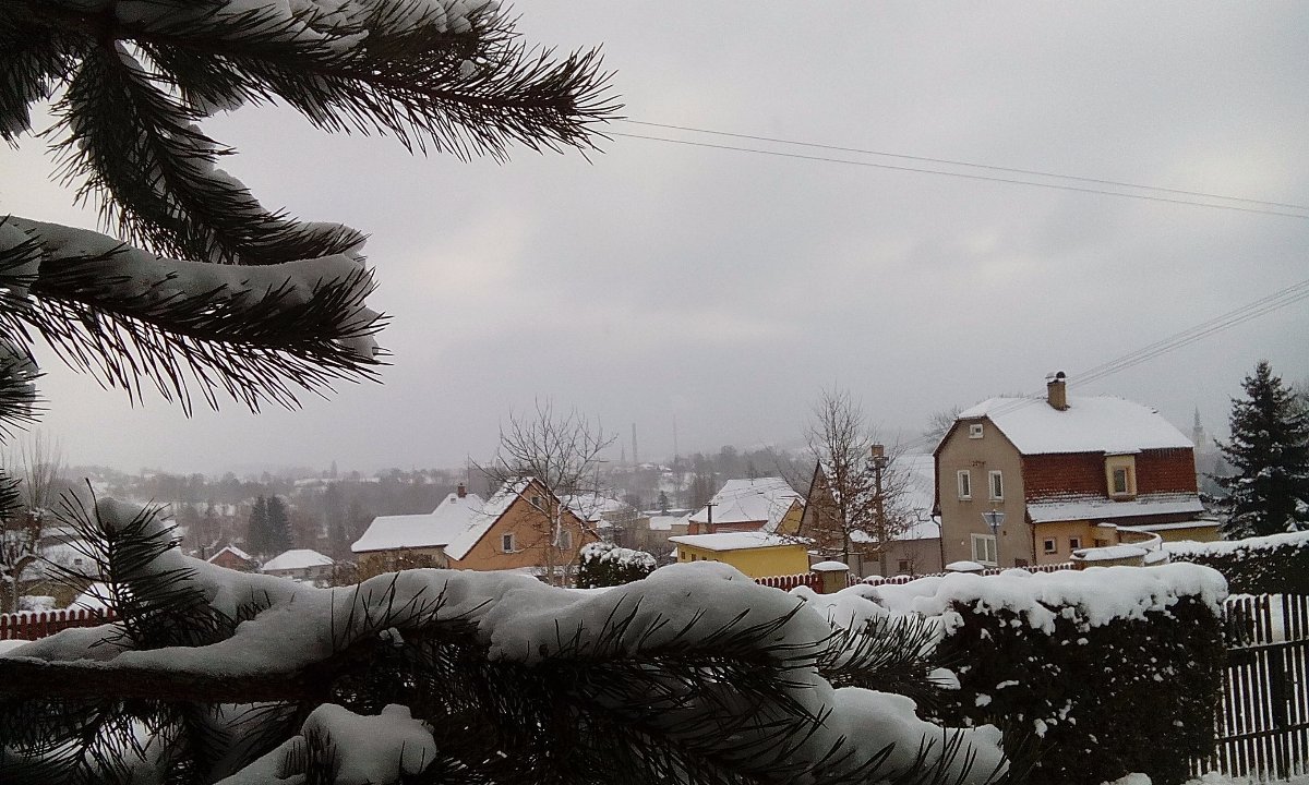 Slabá sněhová přeháňka,mítný vítr,tlak 1032 hPa