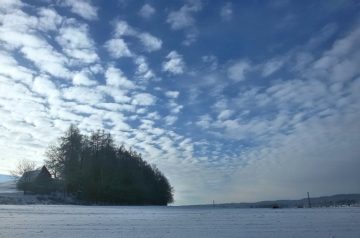 Ráno zcela jasno a modro, nyní se pomalu zatahuje mírný větřík.