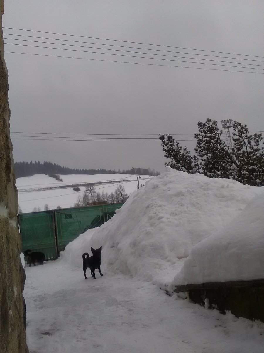 ... po polojasné noci a svítání první snížek od včerejška snášející se cca 10 minut ve vánkovém SZ téměř bezvětří, obl.7/10, pojukávající sluníčko...(včera z večera měřená vrsva sněhu = 26,- cm)...