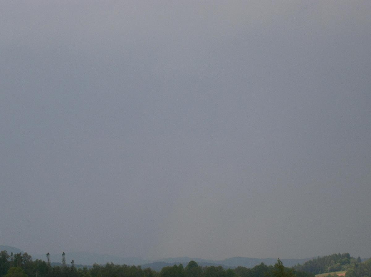 větší oblačnost, vlhkost 68 %, vítr 6 m/s V, max 23,7 °C min 12,3 °C, fotka ze 17 hodiny, Šumava z Jivna u Č. Budějovic