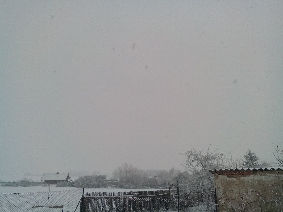 Silně sněží, od rána cca 4 cm nového. Je bezvětří, tlak: 1021 hPa.