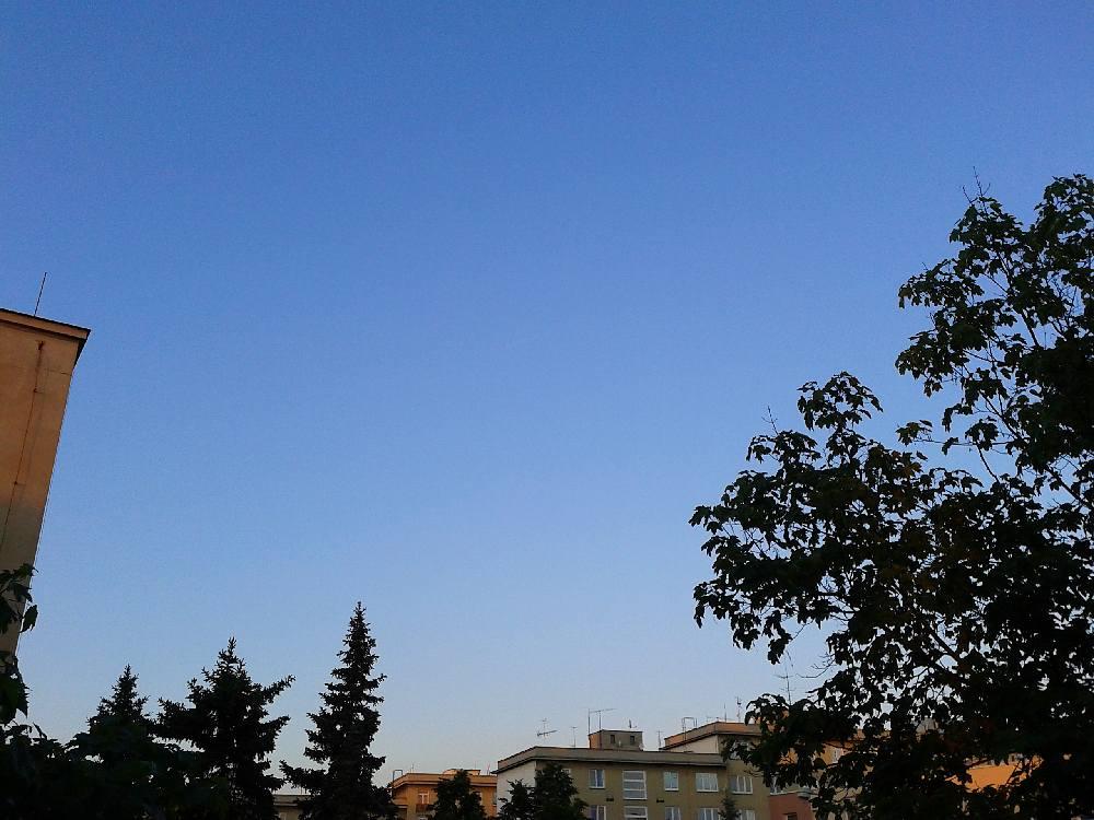 Skoro jasno,oblačnost se rozpadá.Maximum bylo 24,7°C,minimum celkem vysoké 13,9°C.Na fotce dnešní západ Slunce.