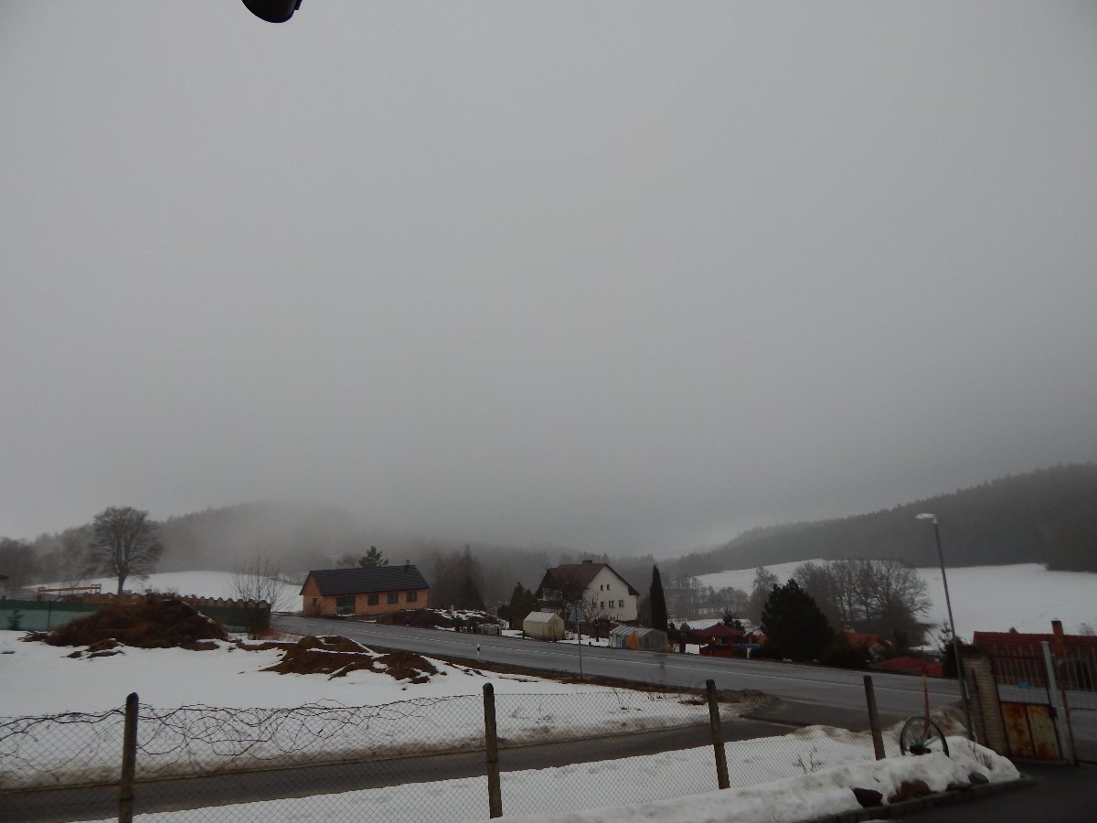 Mlha, oblačnost 100%, zákl.oblačnosti 573,91m.n.m., tlak 1022,9hPa↓, dohlednost 500m, rel.vlhkost 94,1%, abs.vlhkost 4,52g/m3, Z vánek 271° 0,6m/s(1 Bft), poc.teplota -2,56°C, ochl.větrem 0,17°C, tepl.ros.bodu -0,94°C, tepl.mraků -1,99°C, HUMIDEX -2, délka dne u nás = 10hod.23min.1vt.