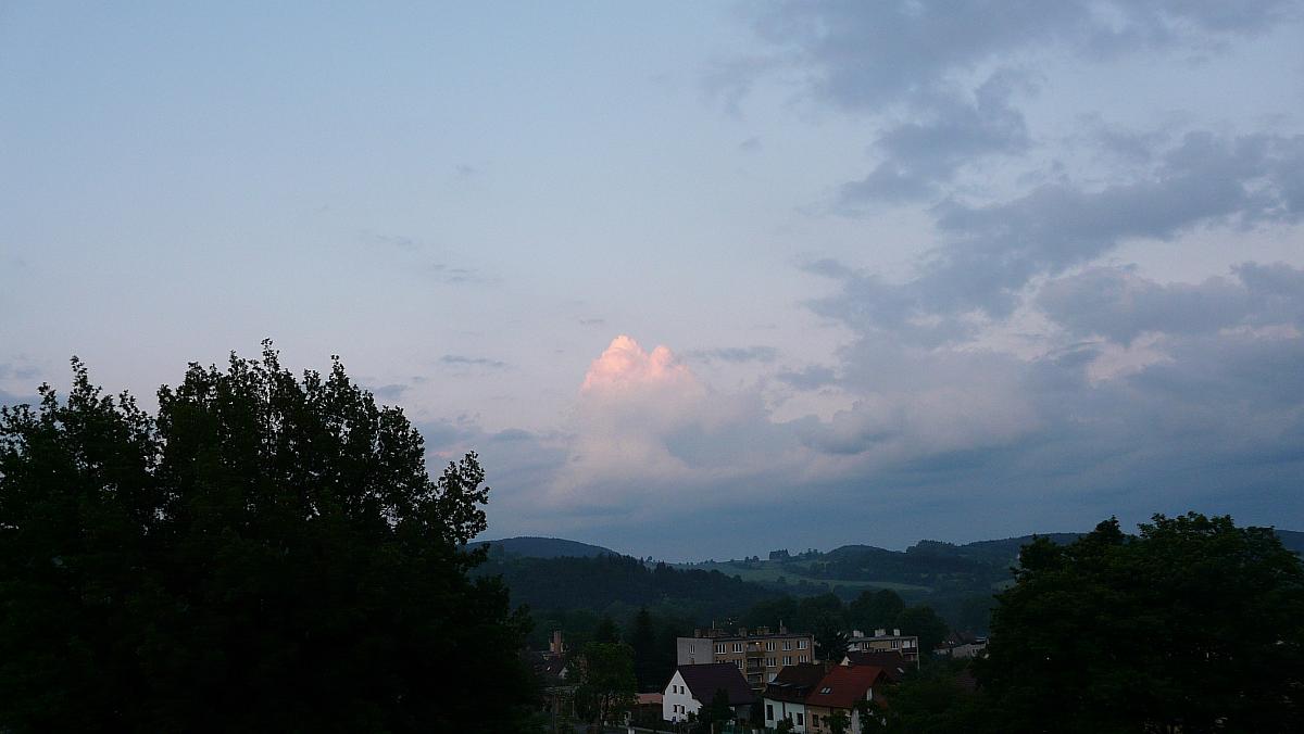 Po celý den oblačno a pár kapek.Foto je z dnešního dne v Tachově.Tam se vyskytly za celý den dvě silnější přeháňky a jedna i s bouřkou.