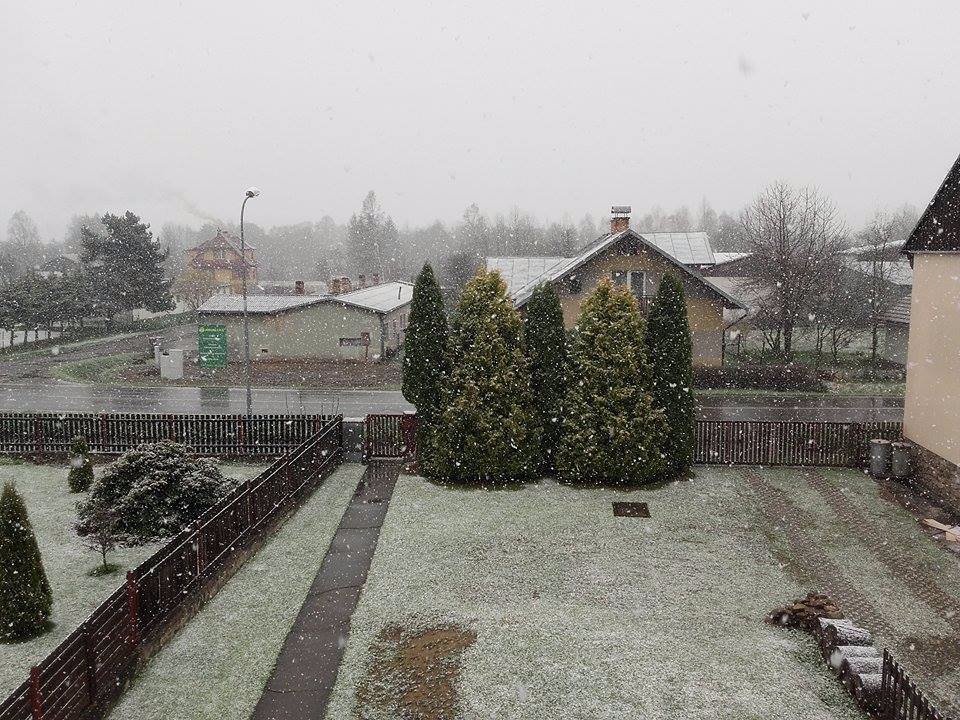 Teplota stále klesá. V 15:30 se do deště začal míchat sníh a v 16:00 začalo čistě a hustě sněžit a sněží do teď s podobnou intenzitou, leží poprašek sněhu