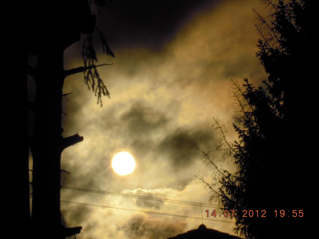 Dopoledne polojasno, zatahuje se stále více, žene se malá přeháňka, celý den silný vítr JZ, tlak v mé výšce 978,5 neměnný. Vojensky: 7 z toho 4na700 2na 2000 1na 5000 jasno, dohlednost 50km. (foto meteor Libuš dopoledne).