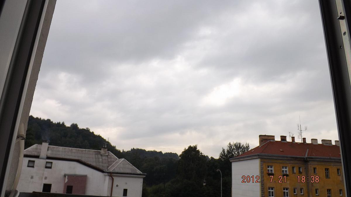 Po dešti, tlak 1014,3, mírný vzestup, bezvětří, vlhkost 84%, kouřmo, dohlednost 15km, mraky 8 z toho 4na600, 2na1500, 2na3000, páří se z lesů porostou houby.