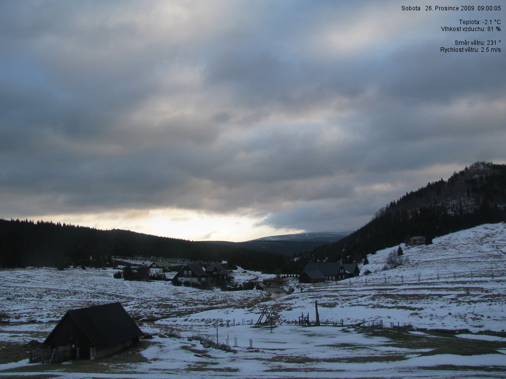Sváteční sobotní ráno je zatím oblačné až polojasné, Přece maličko přituhlo. Rolba upravuje sjezdovku Vigonu v Čenkovicích. Více na www.skicenkovice.eu