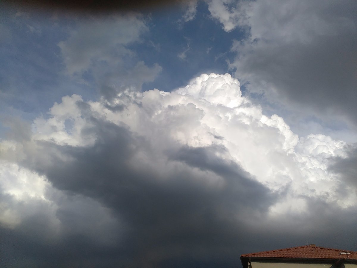 V dálce hřmí a vypadá to, že by mohlo pršet. Vane mírný JV vítr 13km/h, tlak klesá 1008hPa, vlhkost 48%, rosný bod 14,4°C. Foto/cca 18:20hod.