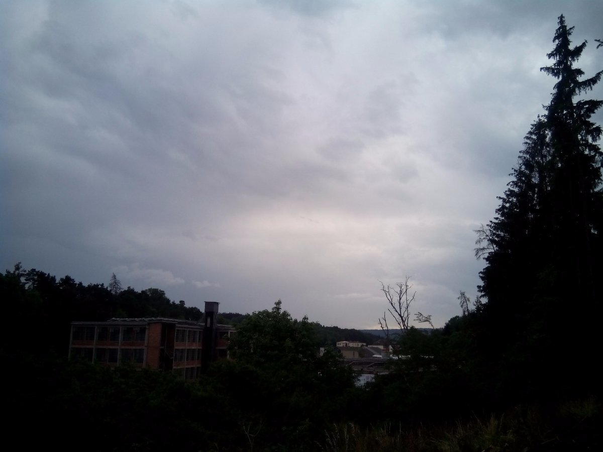 Je oblacno a odpoledne byl silnejsi dest, zapadne a vichodne nas minula bourka. Byli hlasite hromi. Vitr je slaby a v desti spadlo 5 mm.