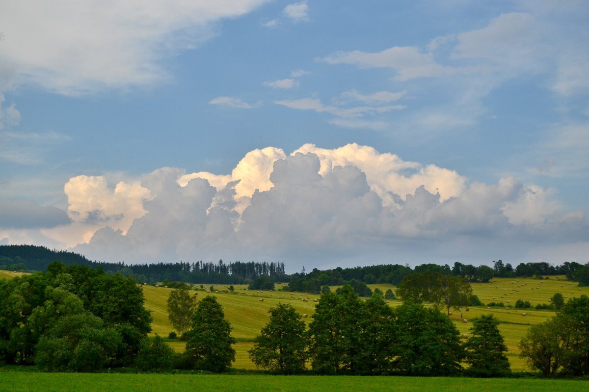 Bouře s přívalovým deštěm. Jižní slabý vítr, tlak 1002,2 hPa a vlhkost 76 %.