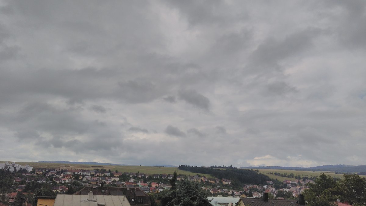 foto z 2017 07 15 v 09:50:48 zachycuje nad hlavou kousek modré oblohy - jinak kolem dokola jsou vidět tmavé mraky - teplota stoupla a je mírný vítr