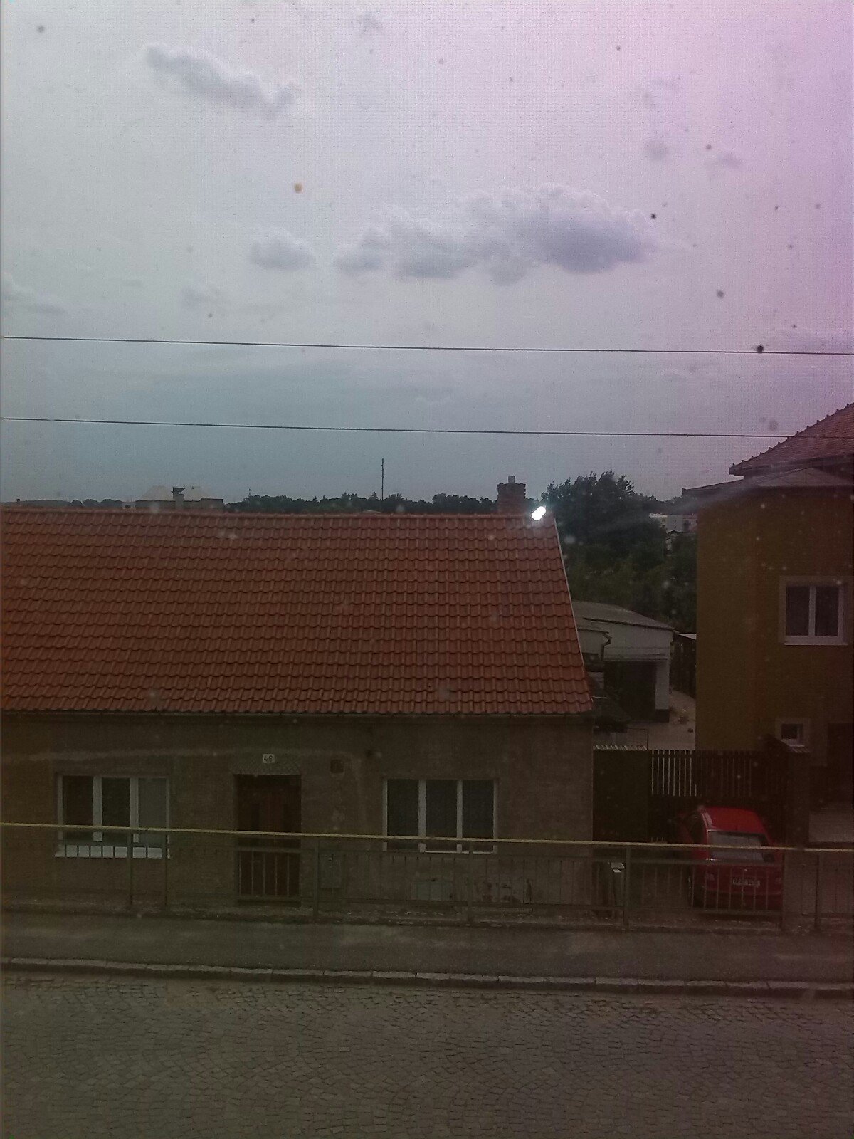 Severovýchodní vánek 5km/h, tlak 1015hPa, vlhkost 31%. Na Z od nás je bouřka a je slyšet hřmění.
