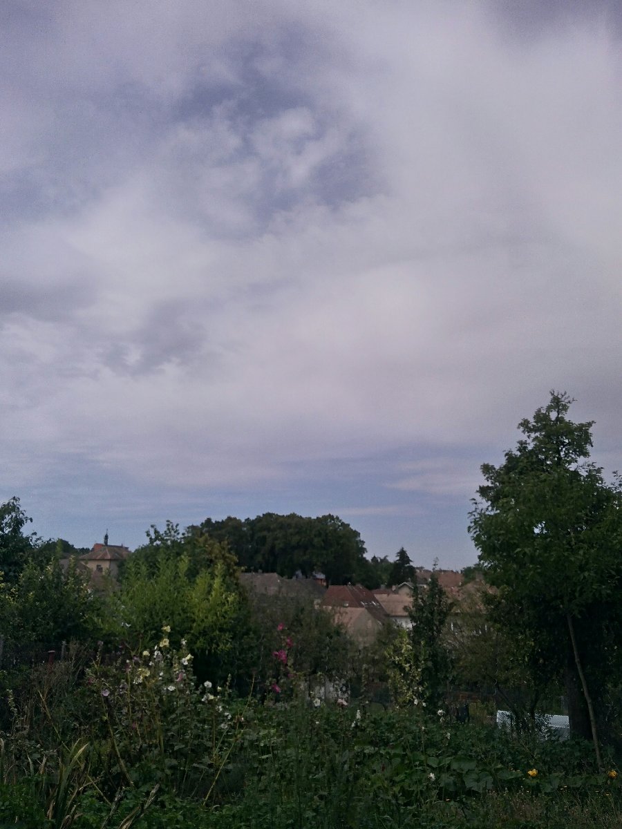 Slabá přeháňka od JZ. Vypadá to na pozůstatek z bouřky. Klidno nebo jen slabý vítr.