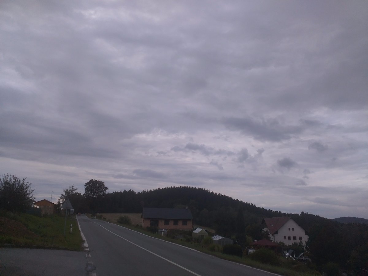 Oblačnost 100%, zákl.oblačnosti 619,56m.n.m., tlak 1011,8hPa→, dohlednost 8km, rel.vlhkost 93,4%, abs.vlhkost 10,03g/m3, slabý VSV vítr 57° 4,3m/s(3 Bft), poc.teplota 9,71°C, ochl.větrem 7,71°C, tepl.ros.bodu 11,06°C, tepl.mraků 9,93°C, ozon 337D.U.(+7%,nadprůměrný stav), HUMIDEX 13,87, prší(0,8mm/hod.).