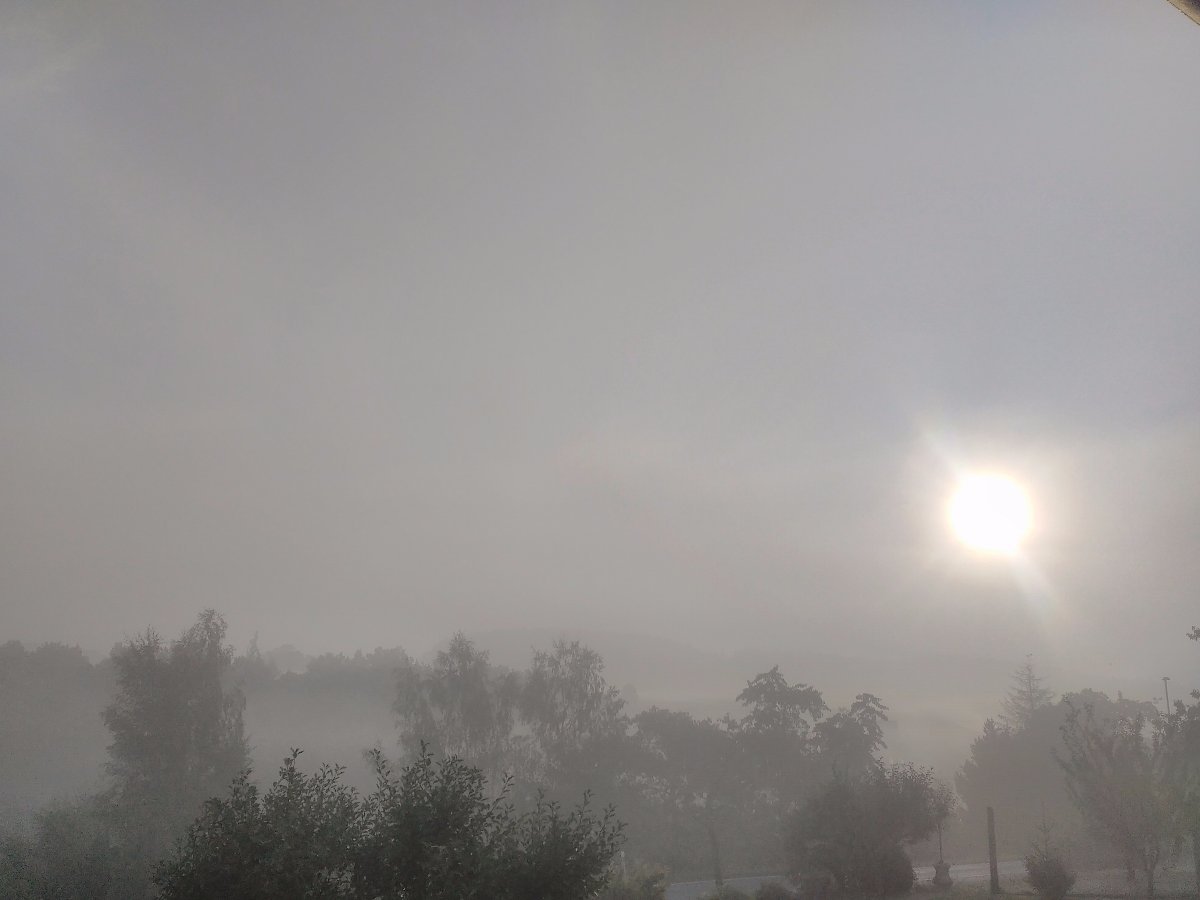 Dnešní minimum bylo 6°C. Je skoro zataženo, níže v centru města je přízemní mlha (na fotografii). Vane slabý severní vítr, tlak 1021hPa, vlhkost 99%.