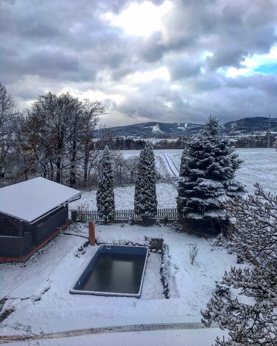 do rána 0.9°C, slabý až mírný vítr, sníh se drží v okolí nad 500m.n.m.