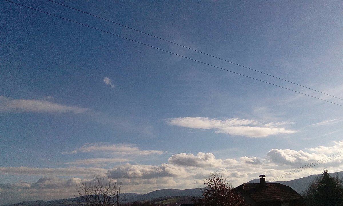 Oblačnost 55,5%, zákl.oblačnosti 1175,52m.n.m., tlak 1023,3hPa→, dohlednost 20km, rel.vlhkost 79,9%, abs.vlhkost 4,94g/m3, JJV větřík 163° 3,3m/s(2 Bft), poc.teplota -0,61°C, wind chill -0,46°C, tepl.ros.bodu 0,43°C, tepl.mraků -1,71°C, ozon 331D.U.(+9%,nadprůměrný stav), HUMIDEX 1,60°C.