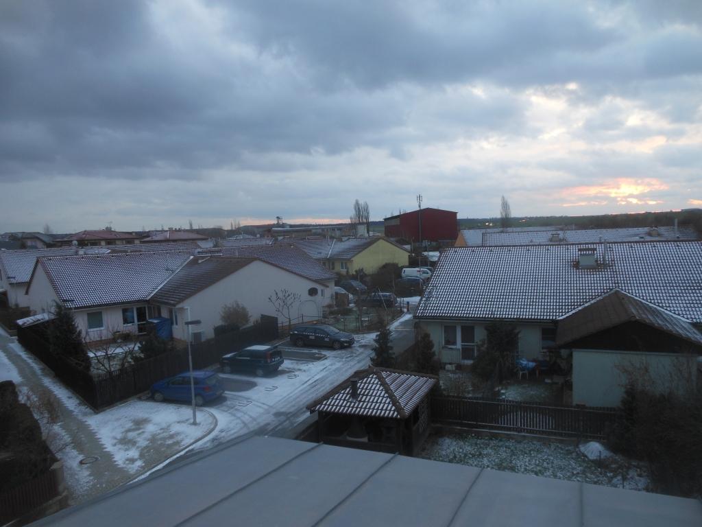 Oblačno,sníh je sice už rozfoukaný ale dle měření na více místech je průměr 6cm.Jinak vítr zatím silnější SZ 7m/s.A přikládám fotku již zimní krajiny společně s postupně zapadajícím Sluncem