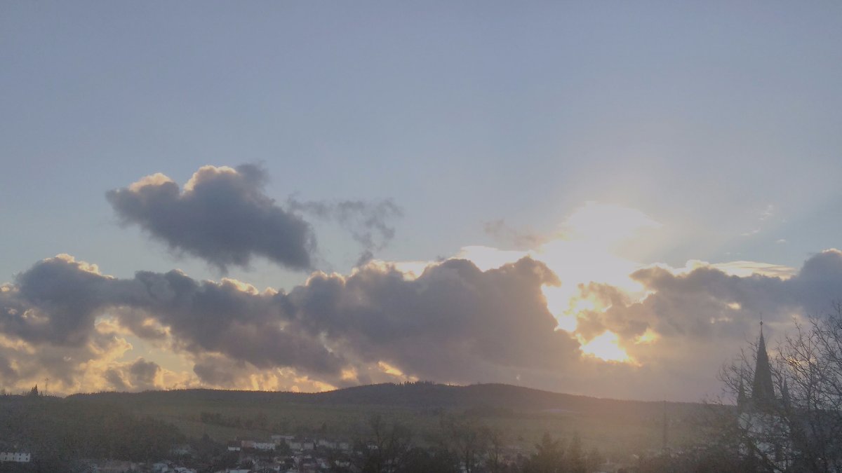 Ještě posílám foto z dnešního rána (7:45), kdy začalo pršet a vycházelo slunce