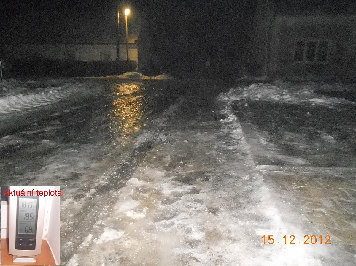 Kouřmo a teplota celý večer stoupá. Obr. Kluzká průhledná ledovka dnes dopoledne.