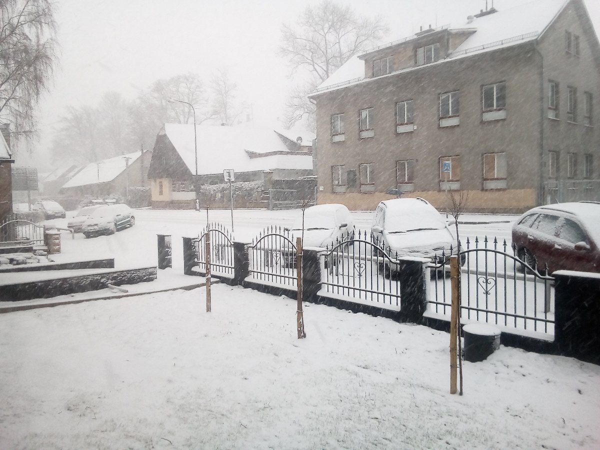 Sněžení. Mokrý sníh na povrchu taje. Mírný vítr.