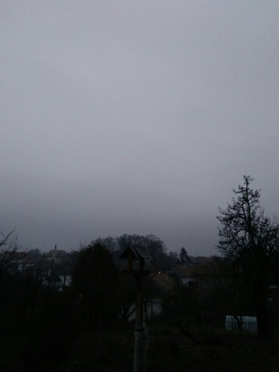 V dálce začíná být mlhavo. Dnešní minimum bylo 0,9°C. Západní vánek, tlak 1013hPa, vlhkost 85%.