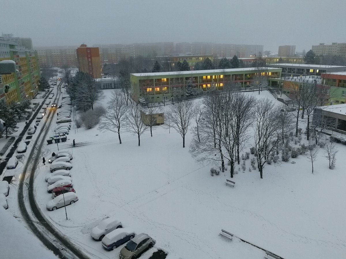 Mírně sněží a fouká. Napadlo už nekolik cm sněhu.