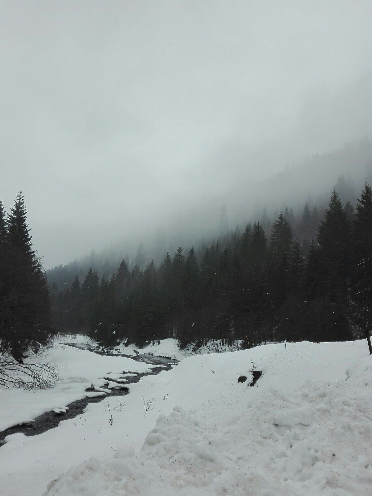 Je mlha a bezvětří. Padal sníh s krupkama a teť jen v mlze popadávaj vločky.