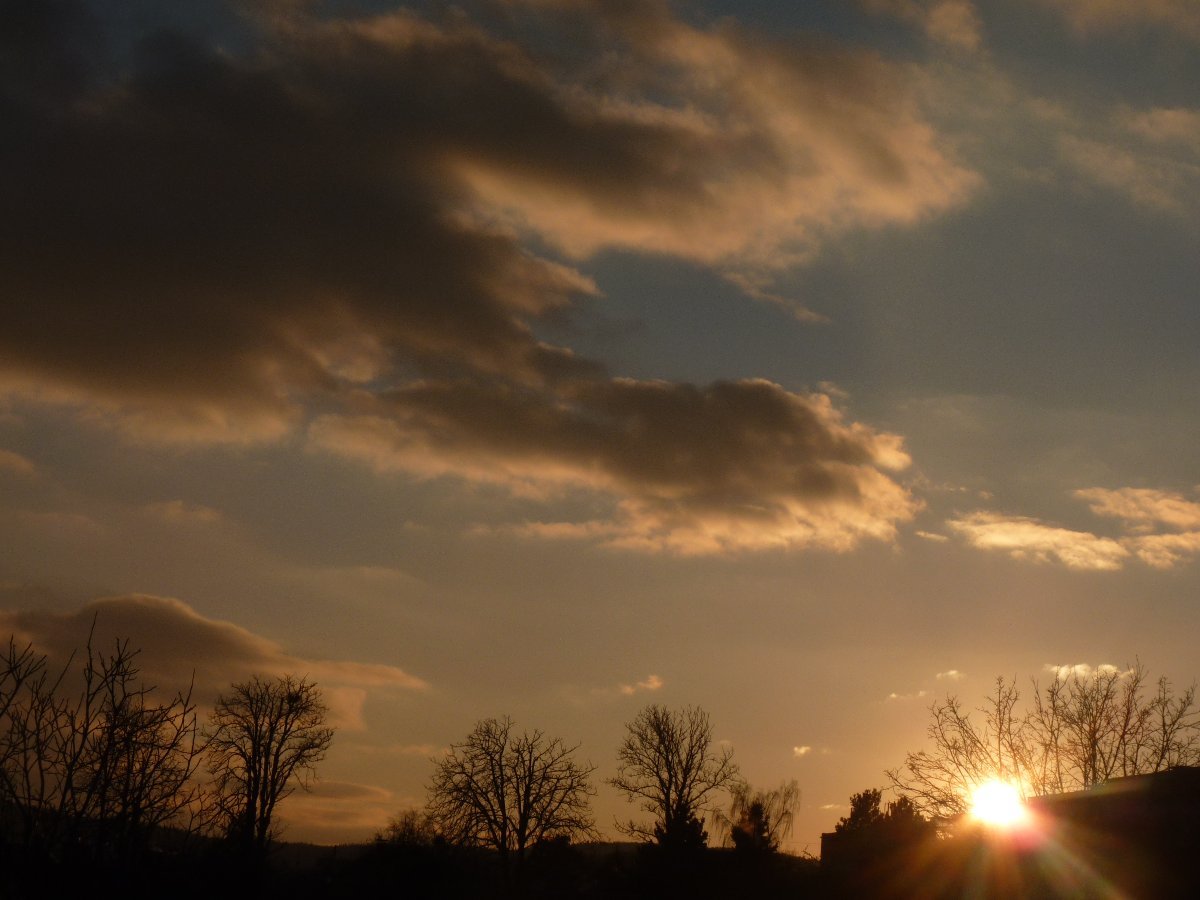 Slabý vítr,tlak 1013 hPa,západ Slunce do zatažené oblačnosti.